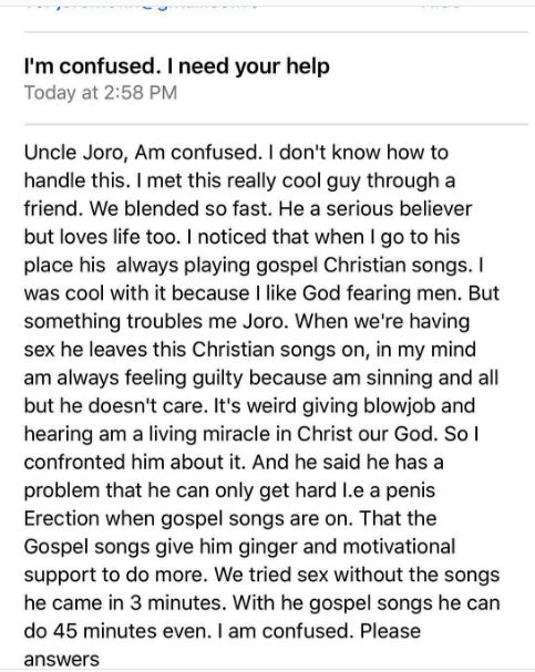 This unnamed young man who is said to be a believer seems to be deriving his sexual inspiration and strength from gospel songs which repeatedly played at the background during pleasure sessions with his girlfriend.
