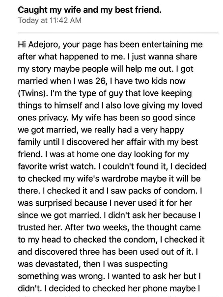 The man went further to disclose that after he found used condoms in his wife's wardrobe and an unknown phone number always calling her, he embarked on a discovery mission and finally got his friend to confess about the illicit affair.
