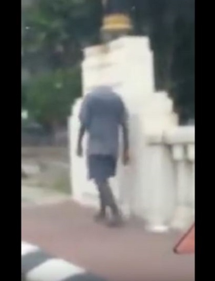 This mobile phone footage taken from inside a moving car shows the man walking along the side of the road with no head on his shoulders.